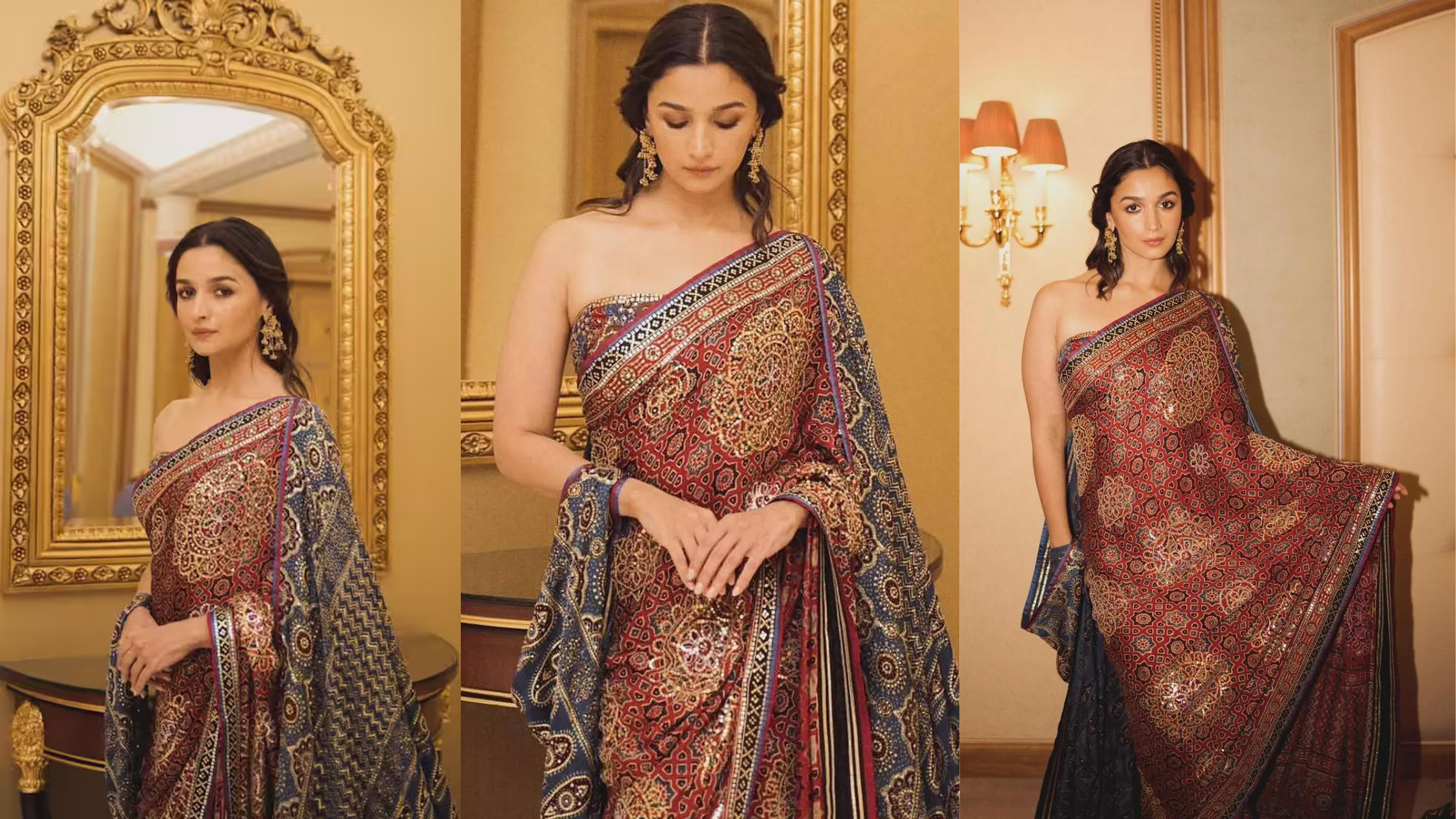 આ ઈવેન્ટમાં તેનો લુક ખૂબ જ ખાસ લાગતો હતો. તે ઈવેન્ટમાં લાલ, વાદળી અને કાળા રંગની સાડી પહેરીને પહોંચી હતી. આ સાડી અજરક પ્રિન્ટની હતી. તેણીએ આ સાડી સાથે ટ્યુબ બ્લાઉઝ પહેર્યું હતું, જે તેના દેખાવમાં આકર્ષણ ઉમેરતું હતું. આ સાથે અજરક પ્રિન્ટ કેપ તેના લુકને સ્ટાઇલિશ બનાવી રહી હતી.