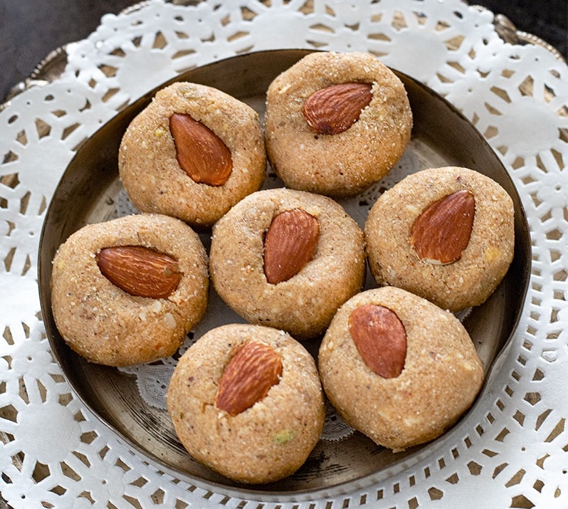 ઘઉંનો લોટ, ગુંદર, બુરા, ઘી, બદામ, કાજુ, સૂકું નાળિયેર લો.