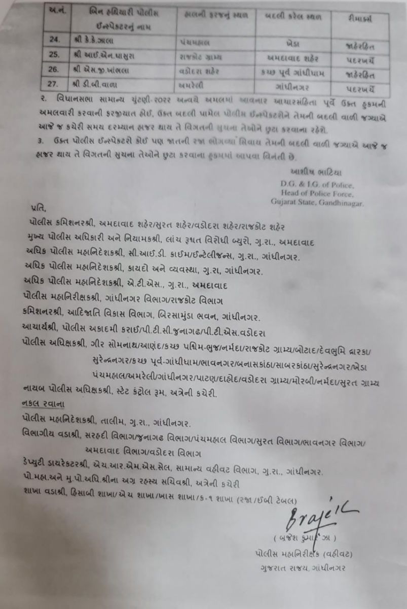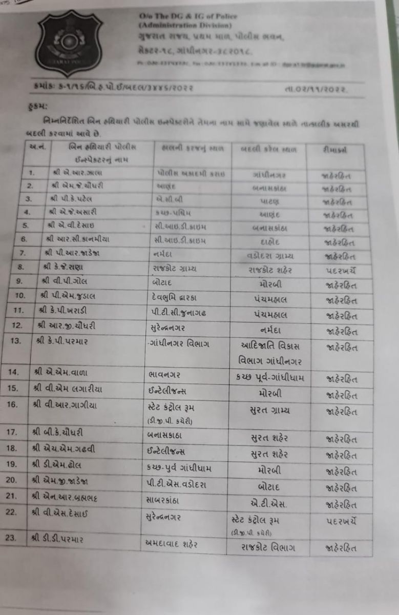 ગુજરાતમાં આજકાલમાં ચૂંટણીની તારીખો જાહેર થઇ જશે. ત્યારે ચૂંટણી પહેલા રાજ્યમાં સતત બદલીનો દોર યથાવત રીતે ચાલી રહ્યો છે. એવામાં ચૂંટણી પહેલા ગુજરાતમાં વધુ એક ફેરફાર કરવામાં આવ્યો છે. રાજ્યમાં બિન હથિયારી 27 PIની બદલી કરવામાં આવી છે. એ માટે ખુદ રાજ્ય પોલીસવડાએ બદલીના આદેશ આપ્યા છે.