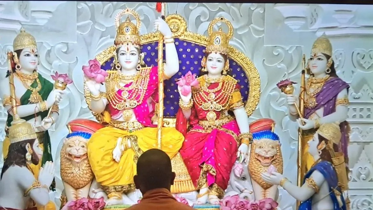 અયોધ્યામાં રામ દરબાર અને કિલ્લાના મંદિરોનો અભિષેક થઈ રહ્યો છે. રામ દરબારમાં રાજા રામ , સીતા, ભરત, શત્રુઘ્ન, લક્ષ્મણ અને હનુમાનજી હશે. બધી મૂર્તિઓ મકરાણાના સફેદ આરસપહાણમાં કોતરવામાં આવી છે. જયપુરના શિલ્પકાર સત્યનારાયણ પાંડેએ સાત મહિનામાં આ મૂર્તિઓ તૈયાર કરી છે. રામ અને સીતાની મૂર્તિઓ એક જ પથ્થરમાંથી બનાવવામાં આવી છે. આ 4.5 ફૂટ ઊંચી મૂર્તિમાં ભગવાન રામ અને સીતા આશીર્વાદ મુદ્રામાં છે. લક્ષ્મણ અને શત્રુઘ્ન 4.5 ફૂટ ઊંચા છે. તે બંને ભગવાન રામ અને સીતાની પાછળ ઉભા છે.
