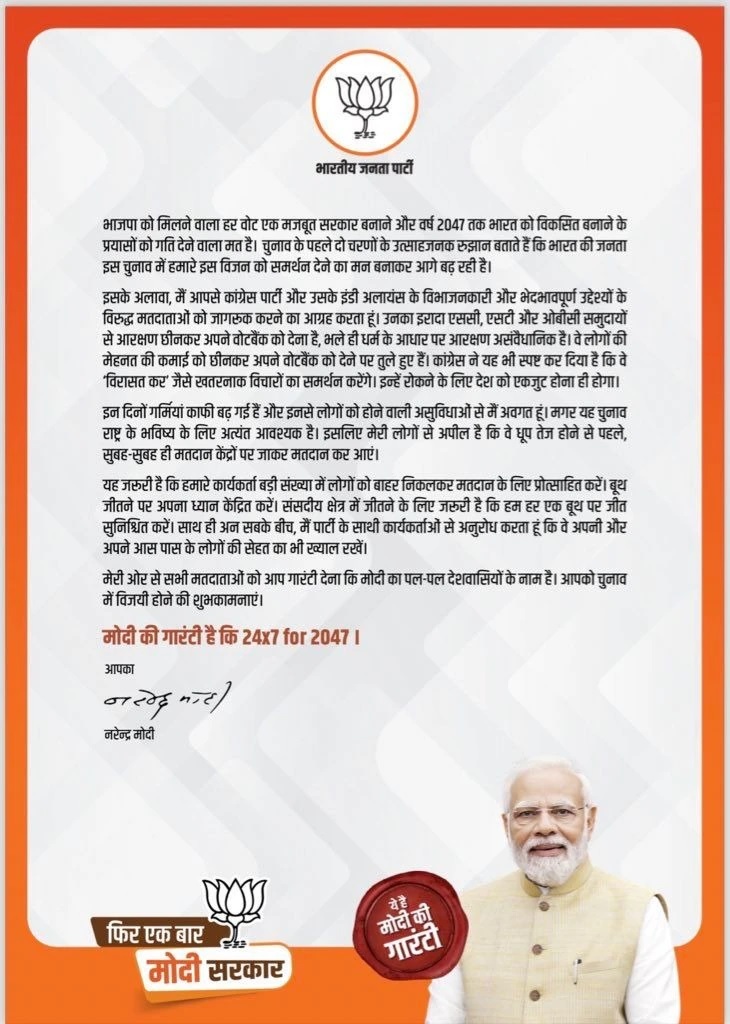 કોંગ્રેસ પર નિશાન સાધતા પીએમ મોદીએ પત્રમાં કહ્યું કે, “તેઓ લોકોની મહેનતની કમાણી છીનવીને તેમની વોટ બેંકમાં આપવા પર તત્પર છે. કોંગ્રેસે એ પણ સ્પષ્ટ કર્યું છે કે તેઓ વારસા ટેક્સ જેવા ખતરનાક વિચારો લાવશે. તેમને રોકવા માટે દેશને જોડવો પડશે.”