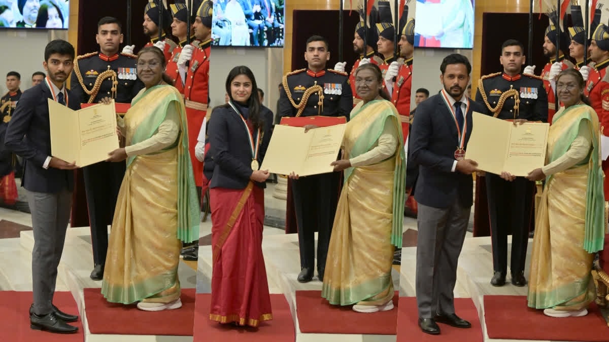 શુક્રવારે રાષ્ટ્રપતિ ભવન ખાતે રાષ્ટ્રીય રમત પુરસ્કાર સમારોહનું આયોજન કરવામાં આવ્યું હતું, જ્યાં રમત જગતના કેટલાક અગ્રણી ખેલાડીઓનું સન્માન કરવામાં આવ્યું હતું. આ પ્રસંગે રાષ્ટ્રપતિ દ્રૌપદી મુર્મુએ મેજર ધ્યાનચંદ ખેલ રત્ન બે ઓલિમ્પિક ચંદ્રક વિજેતા શૂટર મનુ ભાકર અને વિશ્વ ચેસ ચેમ્પિયન ડી ગુકેશને પુરસ્કારથી સન્માનિત કર્યા. આ બંને ખેલાડીઓને તાળીઓના ગડગડાટ વચ્ચે આ સન્માન આપવામાં આવ્યું હતું, જે તેમની મહેનત દર્શાવે છે. મનુ ભાકરે ઓલિમ્પિકમાં દેશને ગૌરવ અપાવ્યું છે, જ્યારે ડી ગુકેશ ચેસ તાજેતરમાં ચેસ ચેમ્પિયનશિપનો ખિતાબ જીત્યો છે.