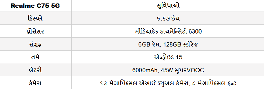 Realme એ ભારતમાં વધુ એક સસ્તો 5G સ્માર્ટફોન લોન્ચ કર્યો છે. આ Realme ફોન 6,000mAh બેટરી સહિત ઘણી શક્તિશાળી સુવિધાઓ સાથે આવે છે. Realme એ આ ફોનમાં MediaTek Dimensity 6300 ચિપસેટનો ઉપયોગ કર્યો છે, જે 6nm આર્કિટેક્ચર પર કામ કરે છે. કંપનીએ આ ફોન Realme C શ્રેણીમાં લોન્ચ કર્યો છે, જે ખાસ કરીને બજેટ ફ્રેન્ડલી વપરાશકર્તાઓ માટે છે. કંપનીએ આ ફોનને વૈશ્વિક બજારમાં પહેલાથી જ લોન્ચ કરી દીધો છે.